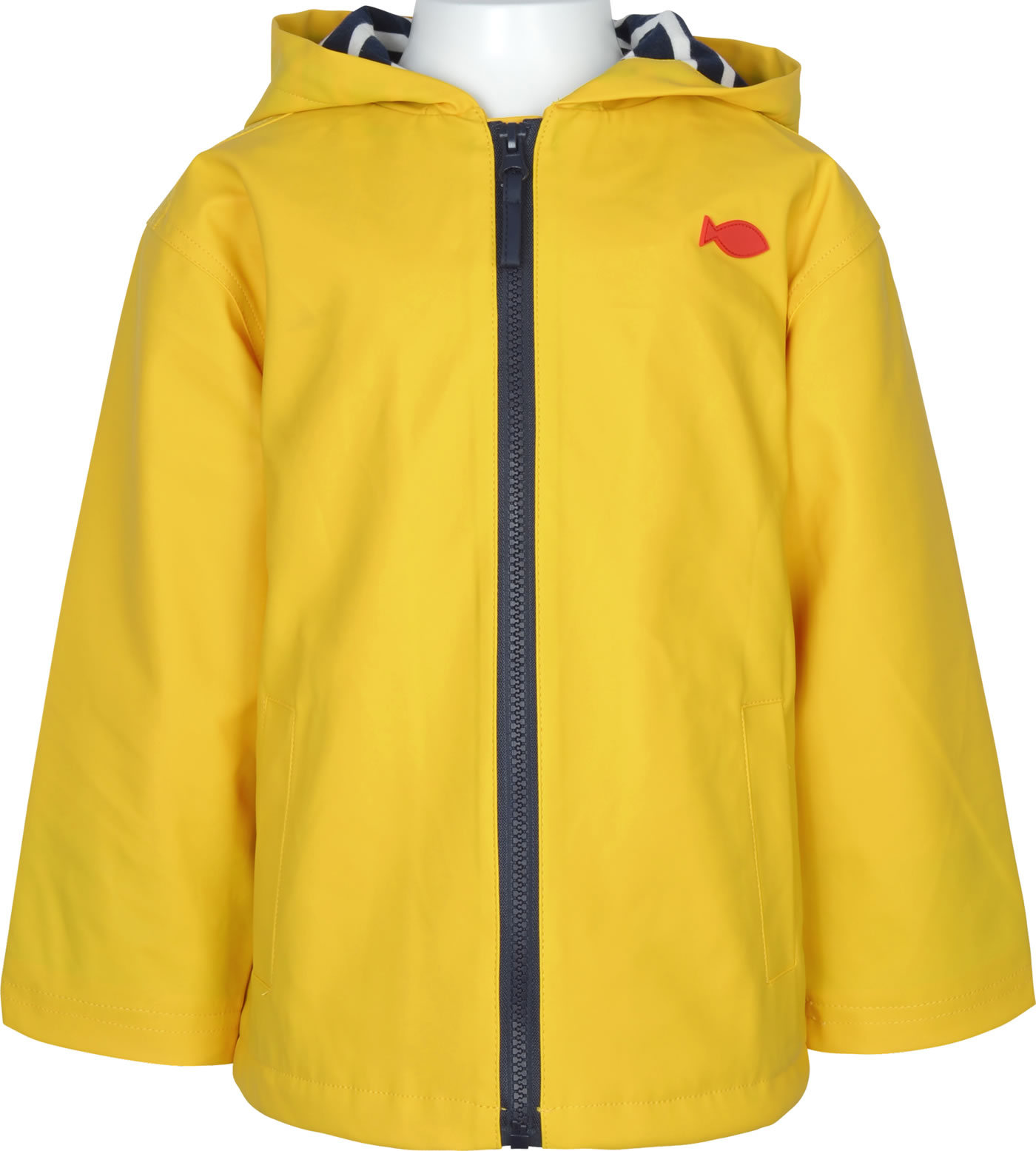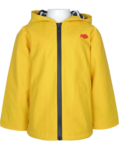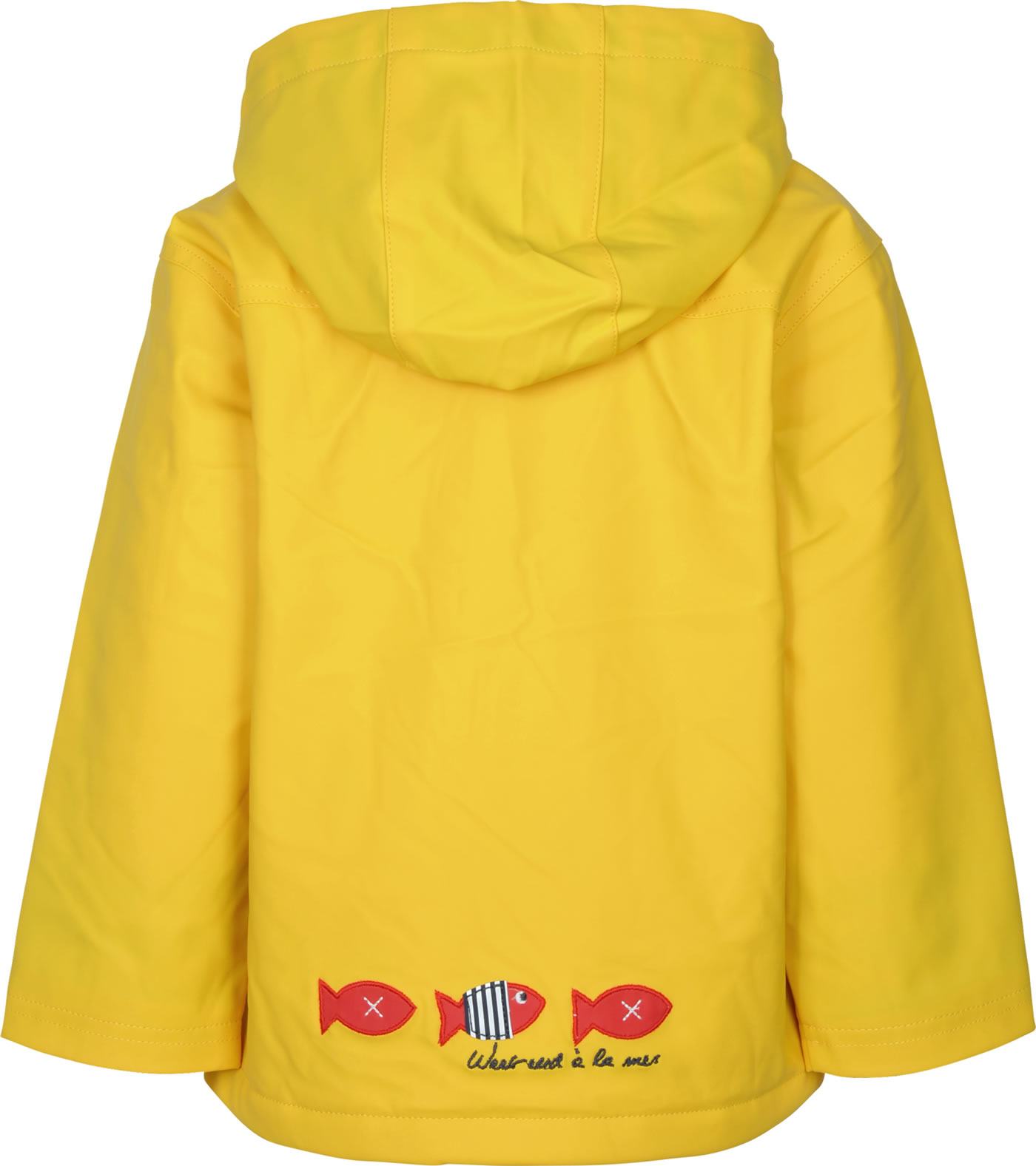 Gefütterte Regenjacke mit Kapuze von WEEKEND A LA MER für Jungen und Mädchen in gelb. Das Material ist wind- und wasserdicht. Verschlossen wird sie mit einem Reißverschluss. Auf der Vorderseite befinden sich zwei Taschen und ein kleiner aufgenähter Fisch. Auf der Rückseite sind drei Fische aufgestickt. Die Jacke ist mit warmem Fleece und die Kapuze mit gestreiftem Jersey gefüttert.
