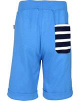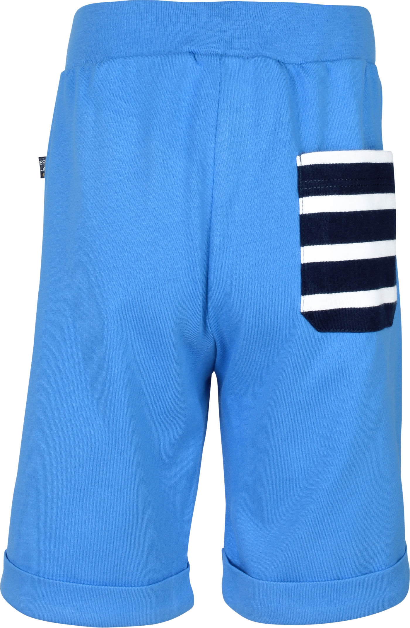 Die uni blaue Shorts mit Gummibund hat eine Gesäßtasche im marine-weißen Muster des Shirts. Die Umschläge am Beinabschluß sind fixiert.