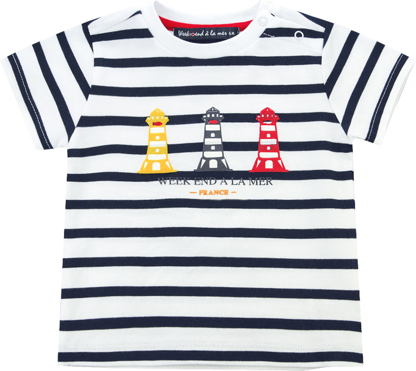 Ein gestreiftes Kurzarm-Shirt von WEEKEND A LA MER für Jungen. Die 3 Leuchttürme in den Farben gelb, schwarz und rot unterstützen den maritimen Charakter. Darunter der Schriftzug FRANCE in leuchtendem Gelb.