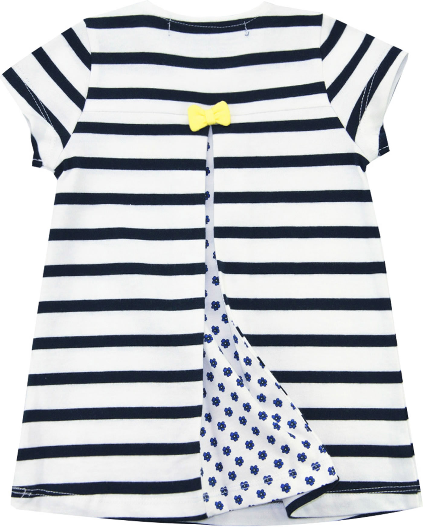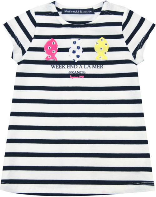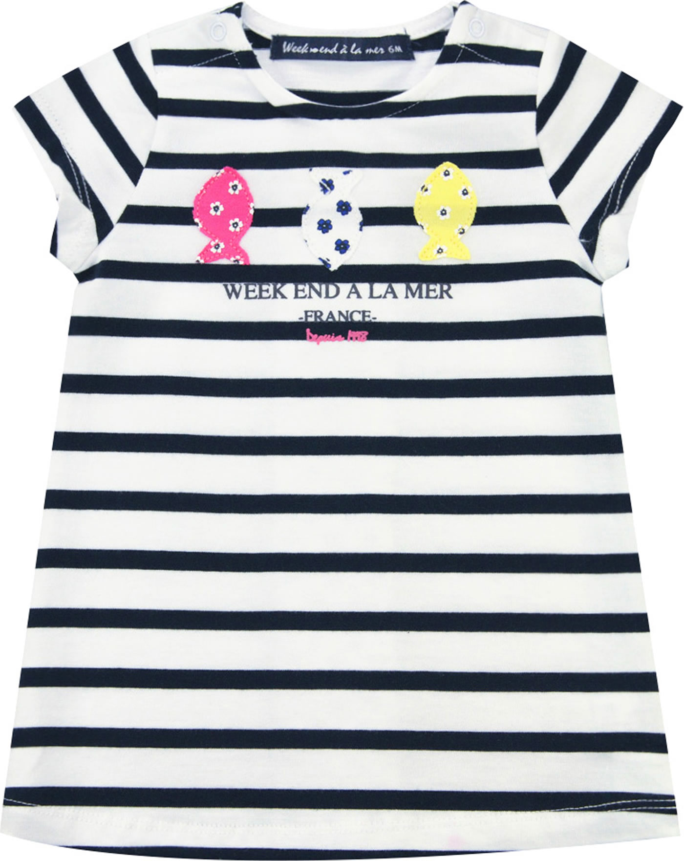 Ein gestreiftes Kurzarmkleid von WEEKEND A LA MER in A-Linie. Auf der Vorderseite sind drei bunte Fische aufgestickt. Knöpfe an der Schulter erleichtern das An- und Ausziehen. Die Rückseite ziert eine gelbe Schleife und aus einer Kellerfalte schaut ein Blumenmuster hervor.