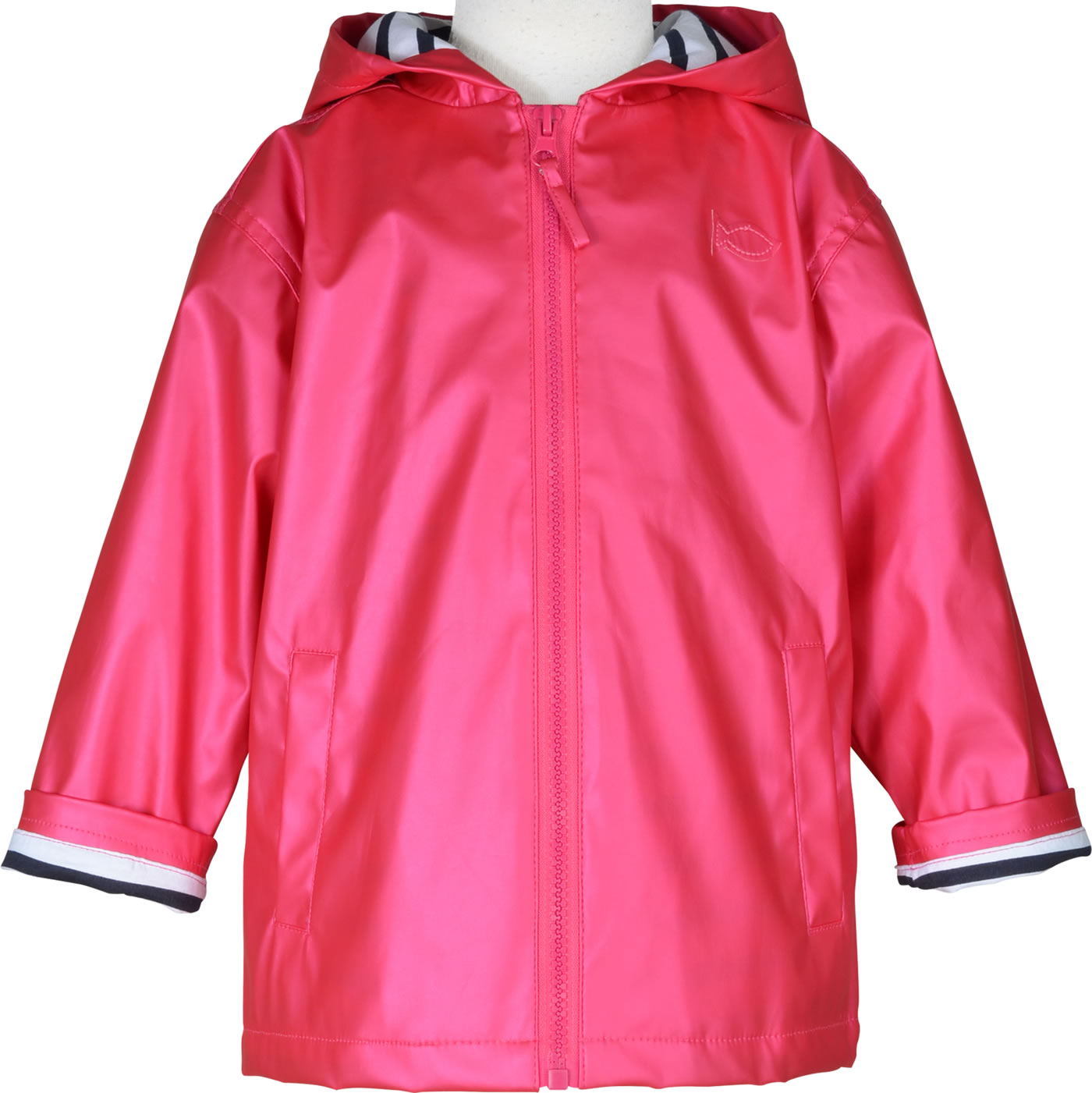 Eine Regenjacke mit Kapuze von WEEKEND A LA MER für Mädchen in pink metallic. Das Material ist winddicht und wasserabweisend. Verschlossen wird sie mit einem Reißverschluss. Auf der Vorderseite befinden sich zwei Taschen und ein kleiner aufgenähter Fisch. Auf der Rückseite sind drei lustige Fische aufgestickt. Die Jacke ist mit weichem und leichtem Baumwolljersey in marineblauen und weißen Streifen gefüttert.