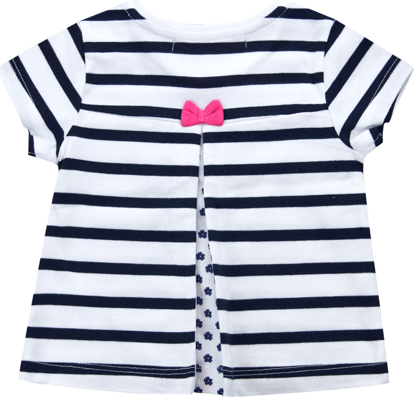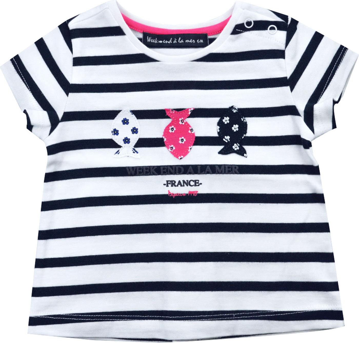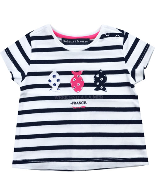 Ein gestreiftes Kurzarm-Shirt in A-Linie von WEEKEND A LA MER für Mädchen. Auf der Vorderseite tummeln sich drei bunte aufgenähte Fische. Die Rückseite ziert eine Schleife in pink und hinter einer Kellerfalte schaut ein Blumenmuster hervor. Druckknöpfe an der Schulter erleichtern das An- und Ausziehen.