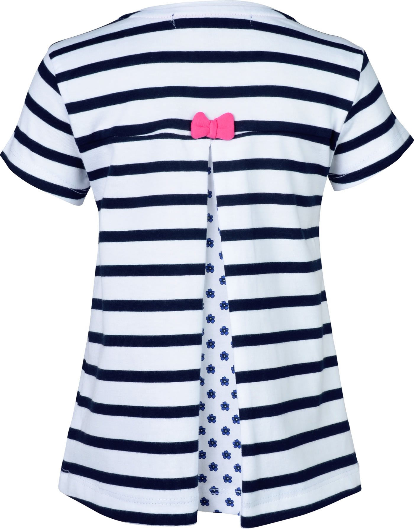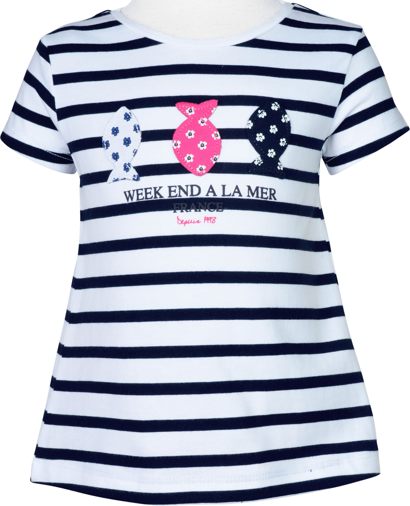 Ein gestreiftes Kurzarm-Shirt in A-Linie von WEEKEND A LA MER für Mädchen. Auf der Vorderseite tummeln sich drei bunte aufgenähte Fische. Die Rückseite ziert eine Schleife in pink und hinter einer Kellerfalte schaut ein Blumenmuster hervor.