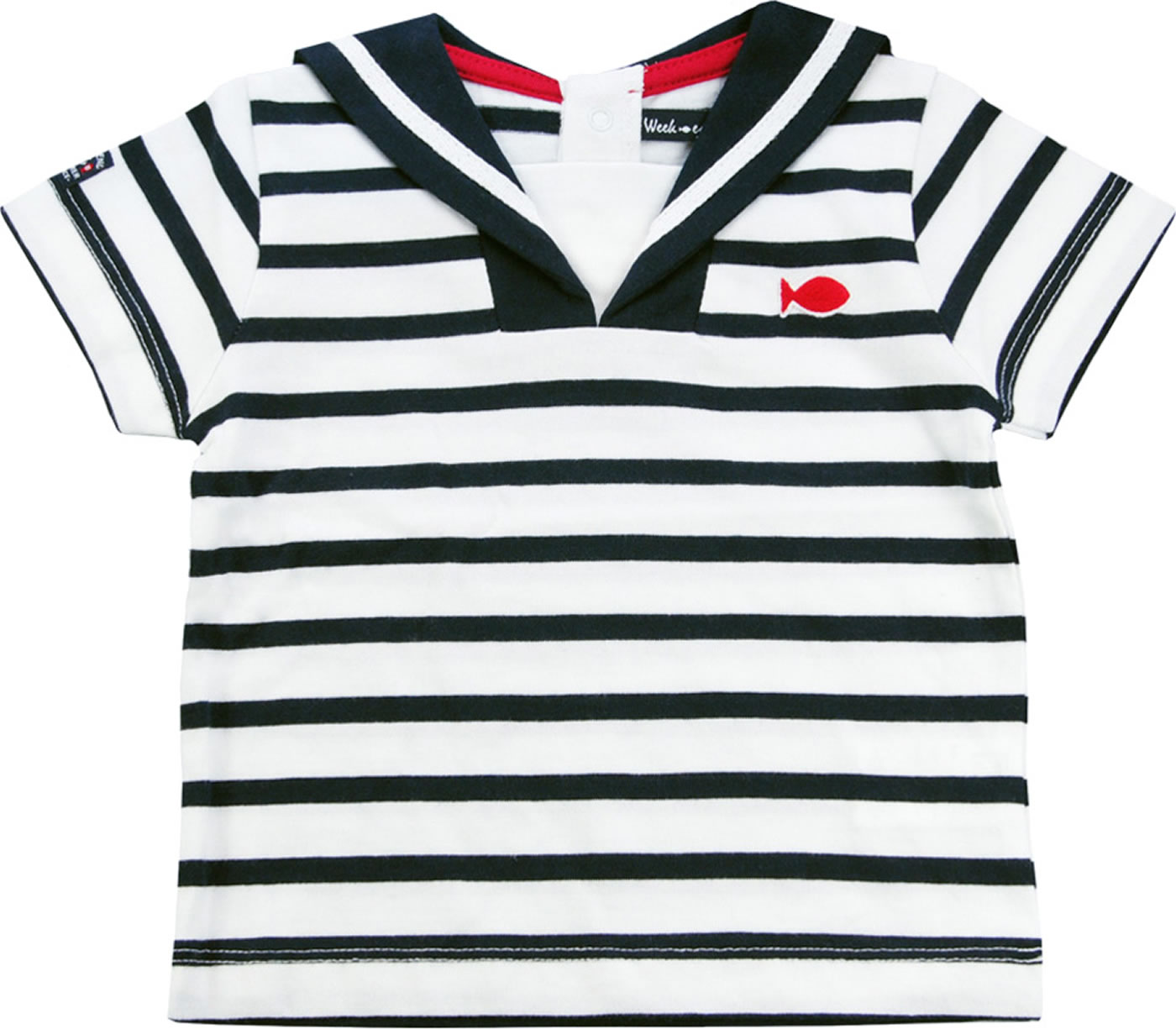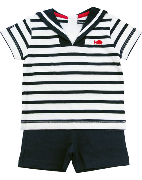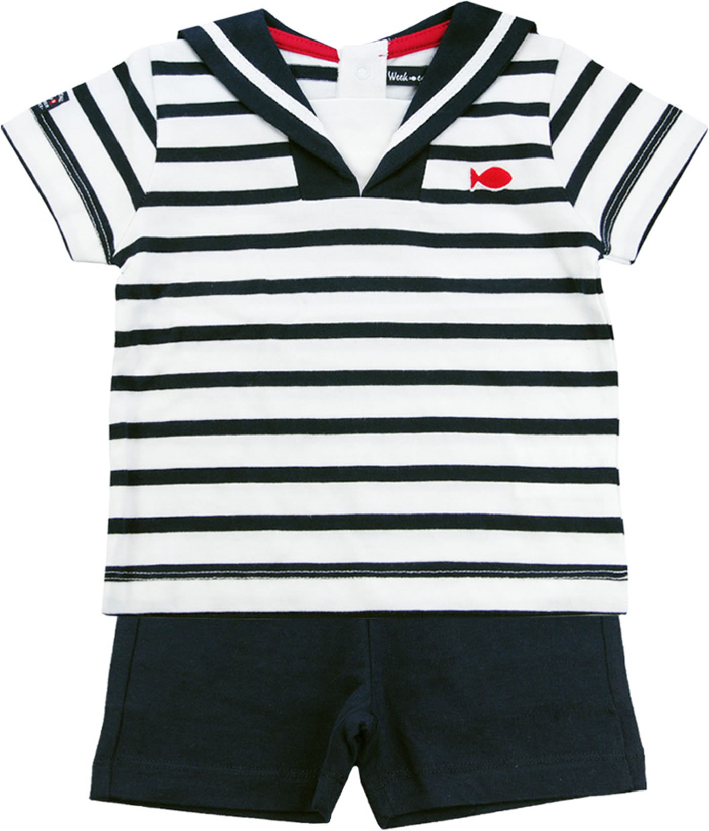 Ein Basic Set mit Shirt und Shorts von WEEKEND A LA MER für Jungen. Der Kragen im Martosenstil hat vorne einen weißen Einsatz. Am Rücken erleichtern drei Druckknöpfe das An- und Ausziehen. Der rote gestickte Fisch ist weiß umrandet und ziert die linke Brust.