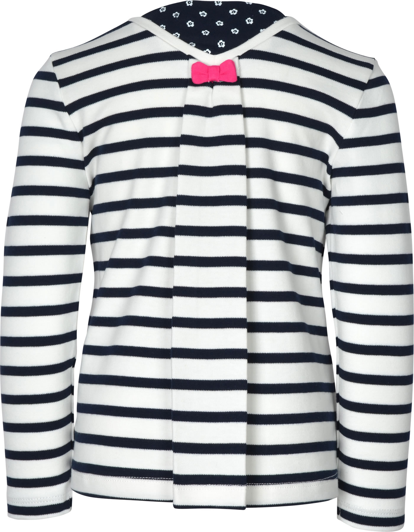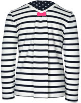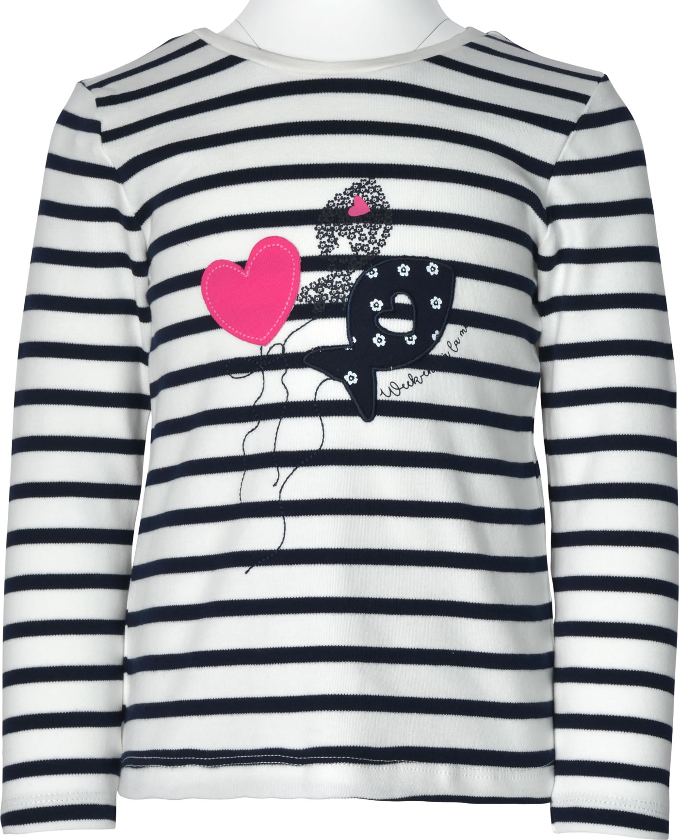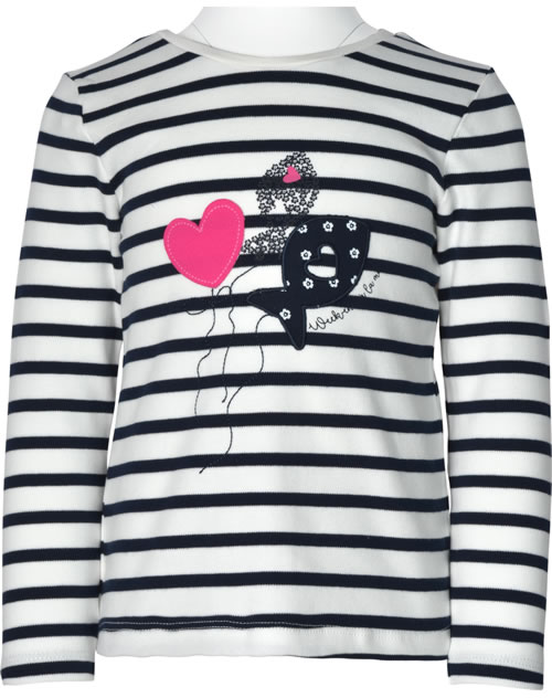 Gestreiftes Langarm-Shirt von WEEKEND A LA MER für Mädchen. Besonders schöne Details sind die Kellerfalte mit Schleife auf der Rückseite und die gestickte Applikation mit Fischen und Herz auf der Vorderseite.