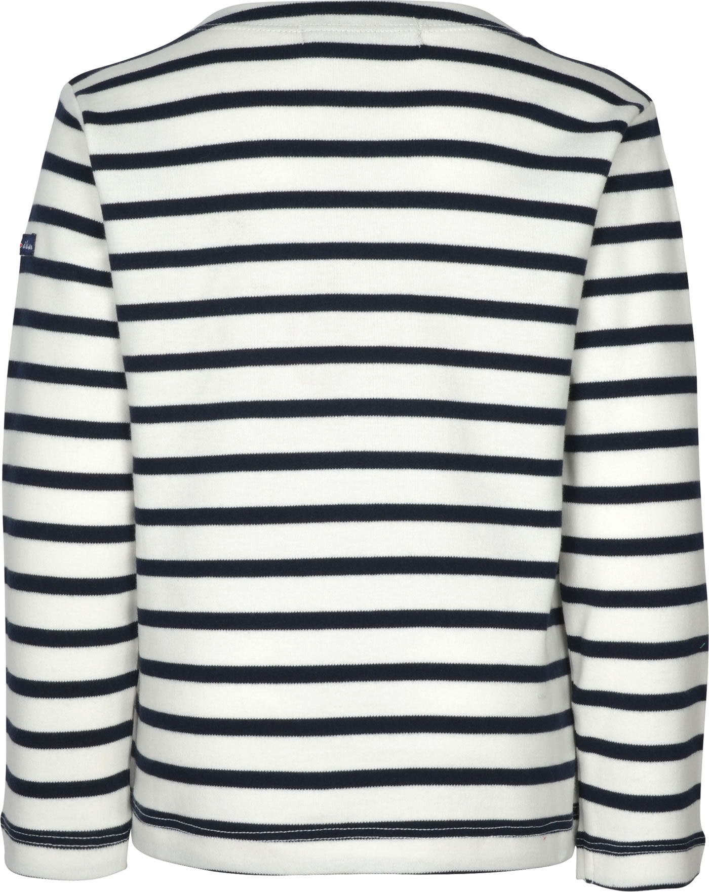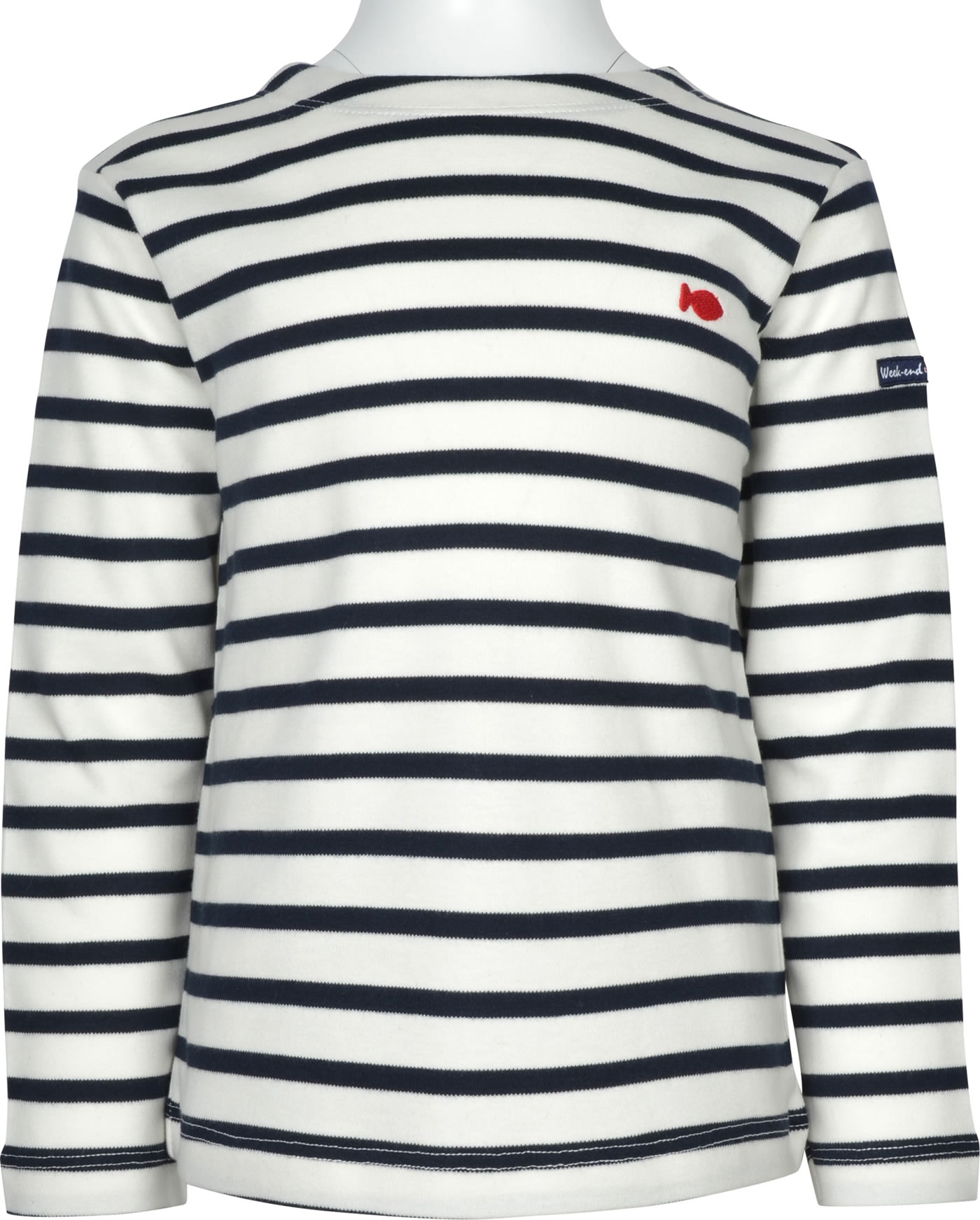 Das weiß und blau gestreifte Langarm-Shirt von WEEKEND A LA MER ist aus weichem, etwas dickerem Jersey. Besonders schön ist die kleine Fisch-Applikation auf der Vorderseite.