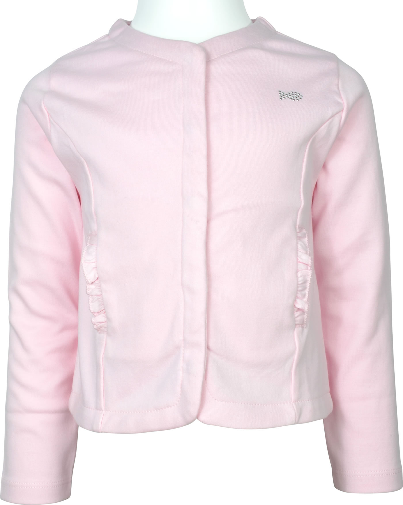 Kurz geschnittene Sweatjacke von WEEKEND A LA MER für Mädchen. Die Jacke hat zwei Taschen auf der Vorderseite, die mit Rüschen besetzt sind. Verschlossen wird die Jacke mit Druckknöpfen. Die Jacke ist leicht tailliert geschnitten und der kleine Glitzer-Fisch ist ein schönes Detail.