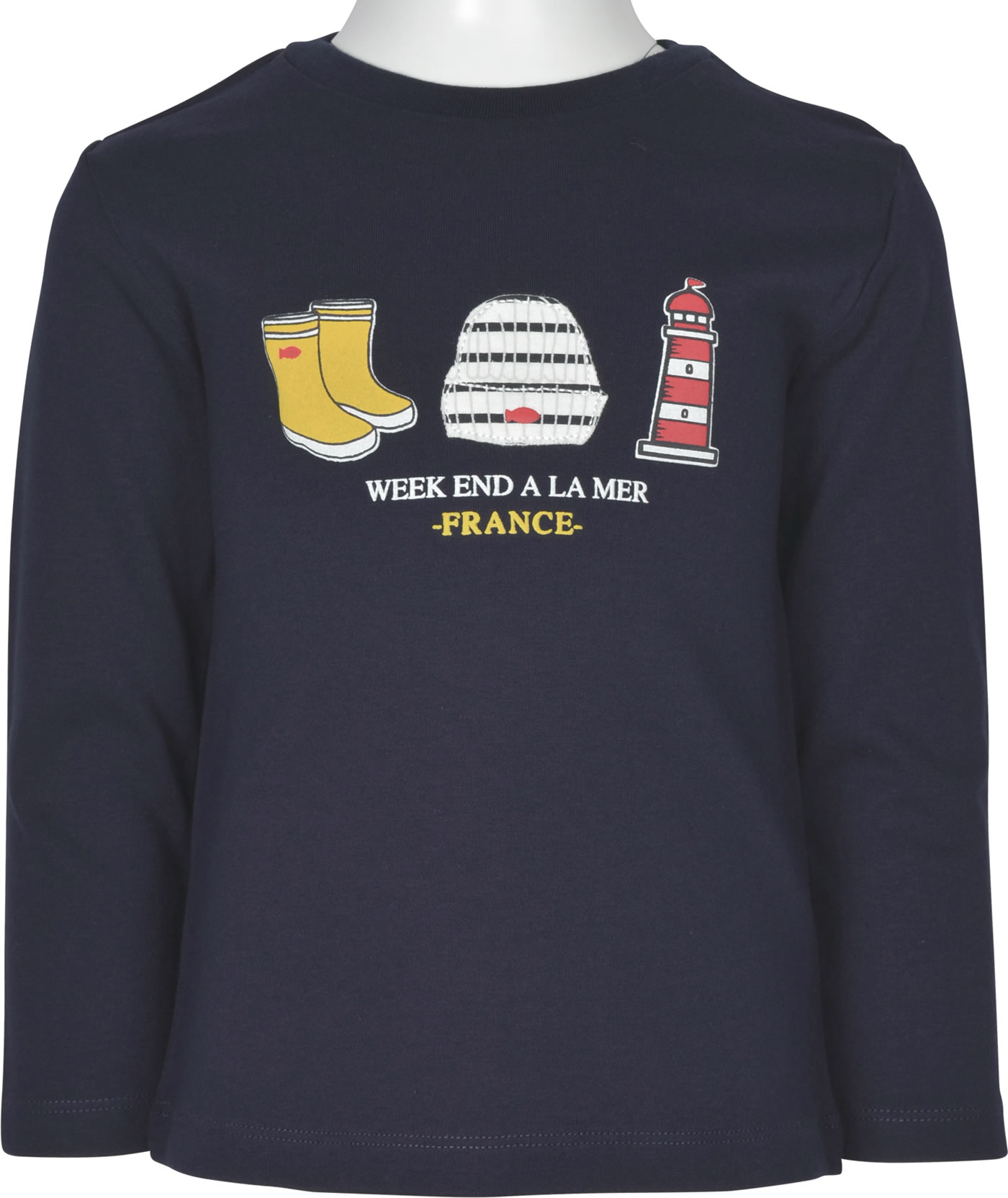 Dunkelblaues Sweatshirt von WEEKEND A LA MER. Das Sweatshirt hat einen tollen Print mit Leuchtturm, Gummistiefeln und Fischermütze auf der Vorderseite. Der weiche Stoff sorgt für einen hohen Tragekomfort.