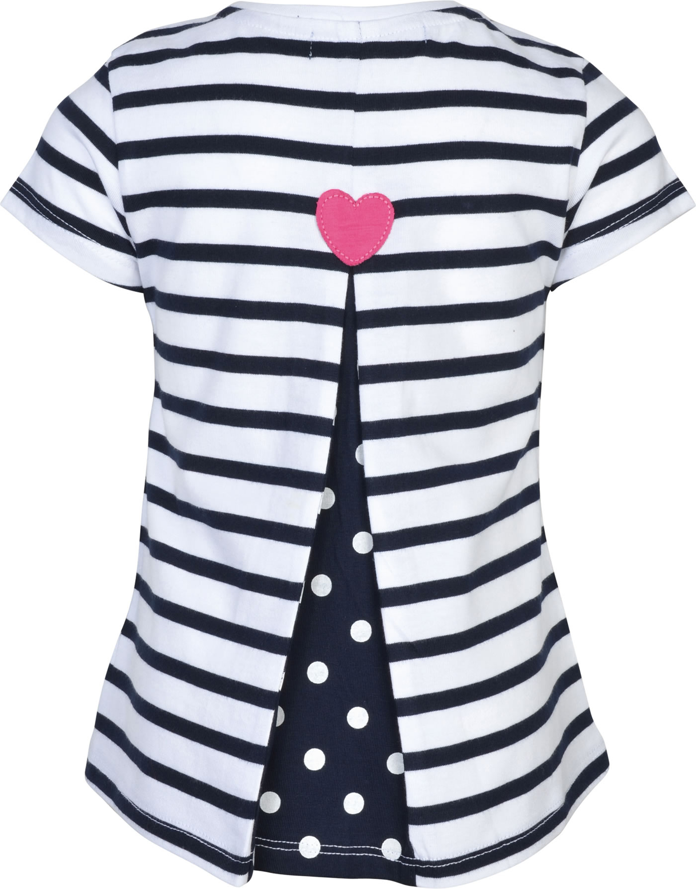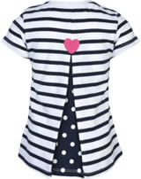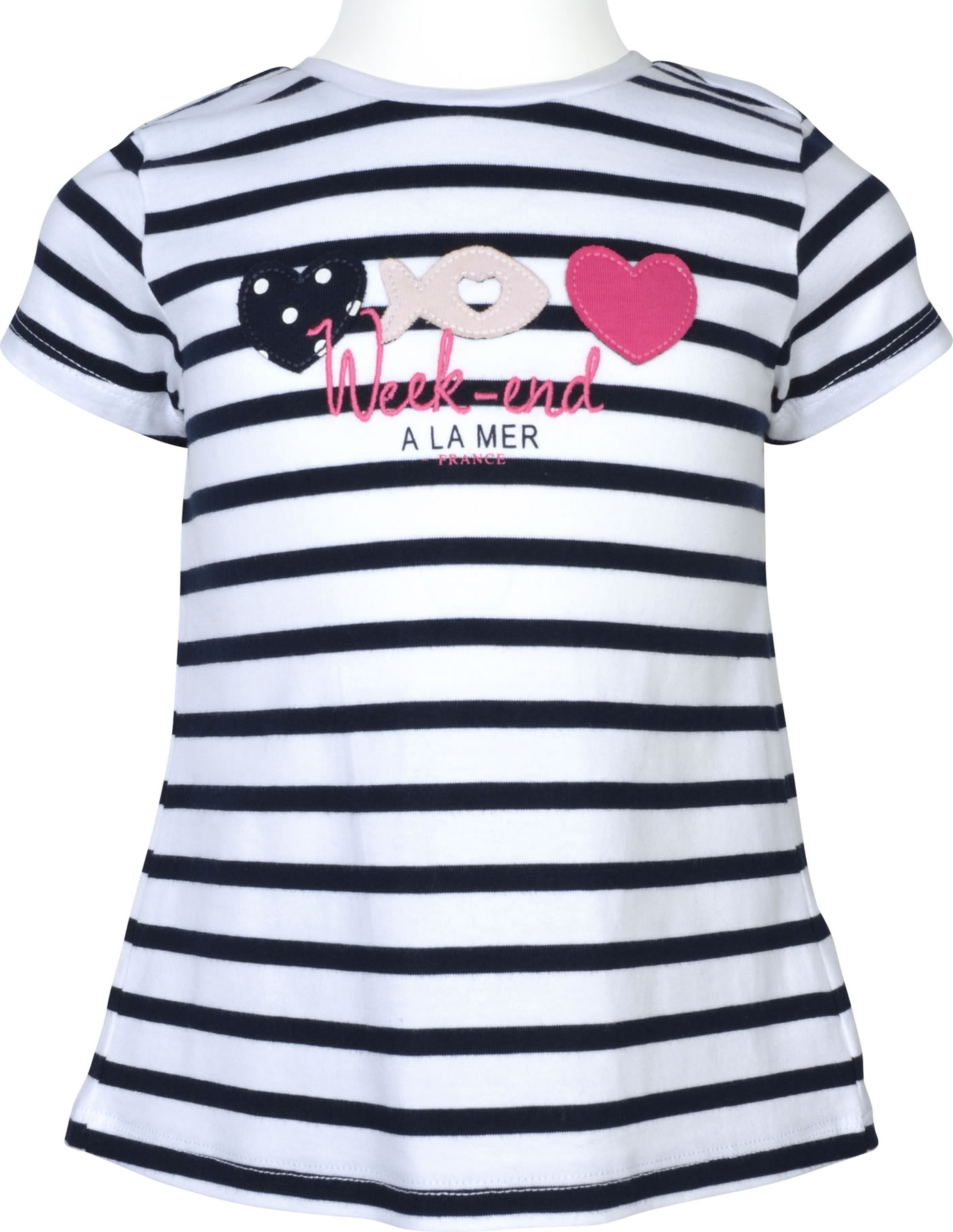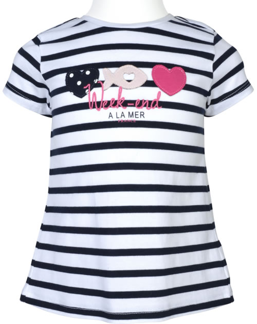 Weiß und blau gestreiftes Kurzarm-Shirt von WEEKEND A LA MER für Mädchen. Das Shirt aus weichem Jersey hat eine tolle Applikation mit Herzen und Fisch auf der Vorderseite. Die Rückseite ziert ein Herz in pink und hinter einer Kellerfalte schaut ein Punktemuster hervor.
