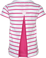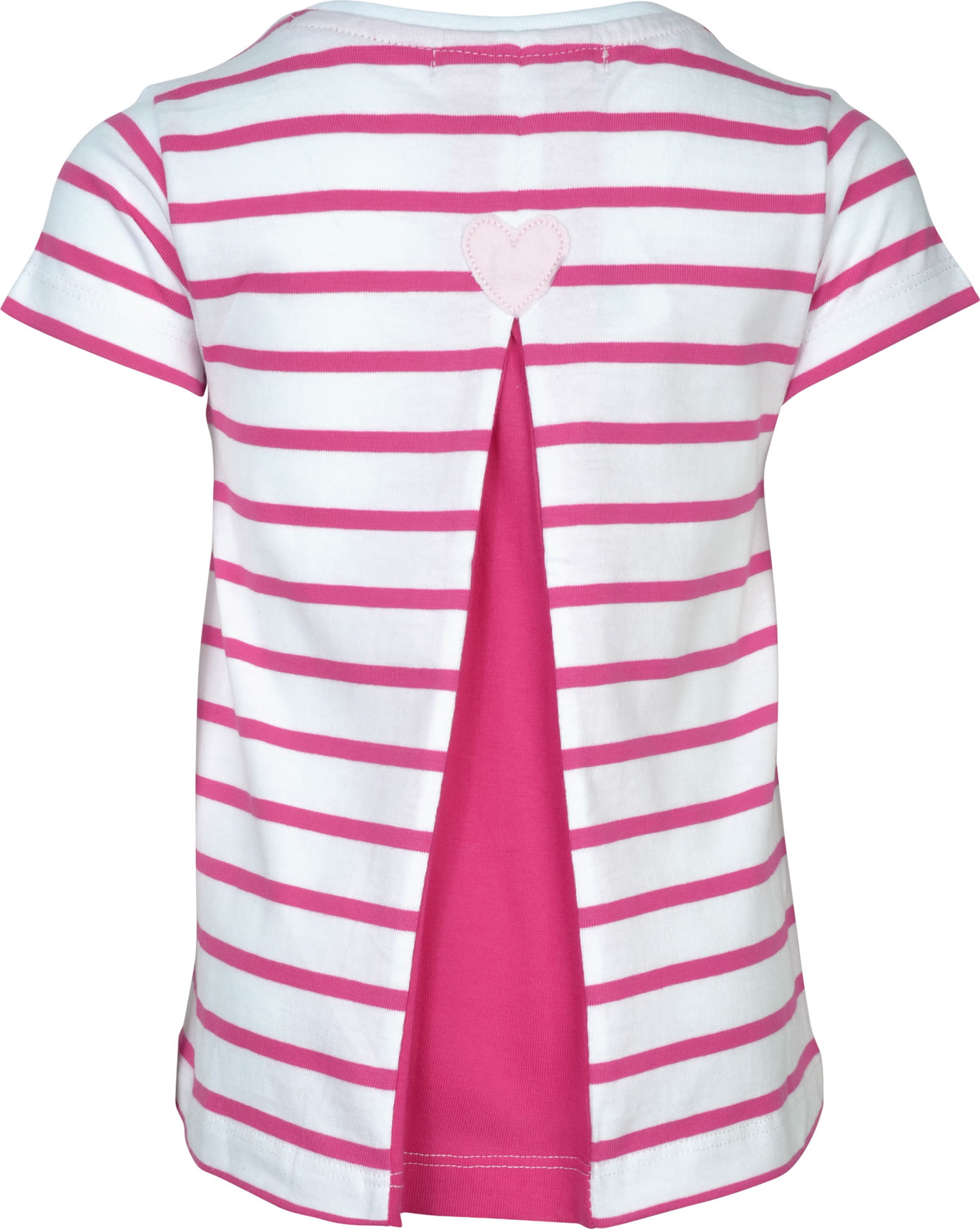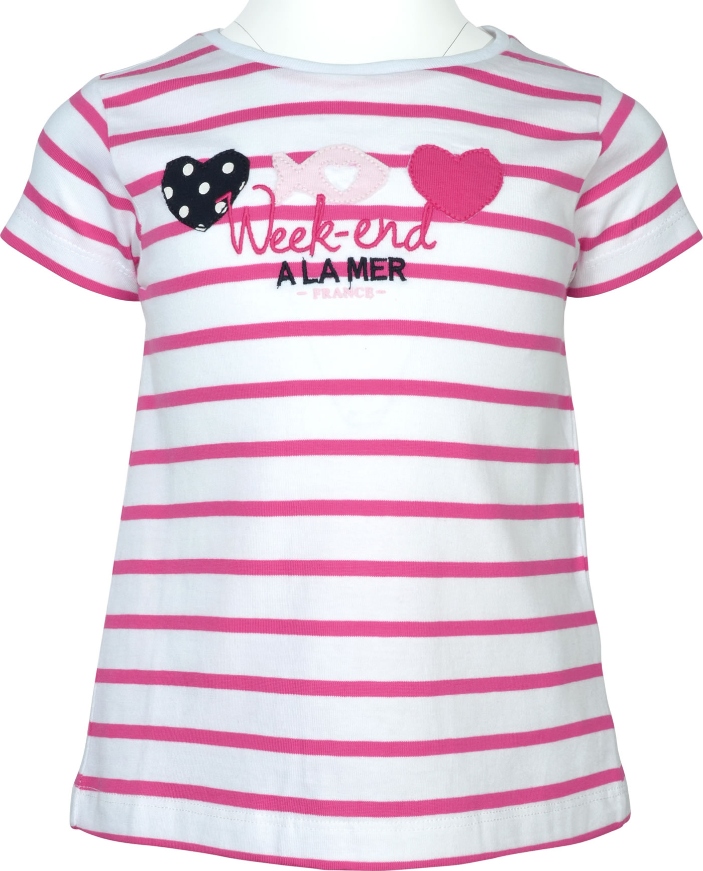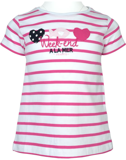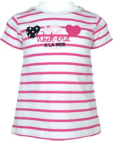 Weiß und pink gestreiftes Kurzarm-Shirt von WEEKEND A LA MER für Mädchen. Das Shirt aus weichem Jersey hat eine tolle Applikation mit Herzen und Fisch auf der Vorderseite. Die Rückseite ziert ein Herz in pink und hinter einer Kellerfalte schaut pinkfarbener Stoff hervor.