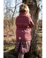 Die Rippbündchen an den Ärmeln haben zusätzlich Daumenlöcher um einen festen Sitz am Handgelenk zu gewährleisten. Die Rückseite ist mit einer Gummi-Stiege abgesetzt und sorgt für eine taillierte Optik. Durch die reflektierenden Details ist der Träger in der dunklen Jahreszeit gut zu erkennen. In den offenen, paspelierten Seitentaschen lassen sich kleine Schätze verstauen. Das mädchenhafte Design, der Schnitt in A-Linie und die verspielte Steppung sorgen für einen Blickfang. Das Material besteht aus 100 % recyceltem Polyester und das leichte Gewicht sorgt für ein angenehmes Bewegungs- und Spielgefühl.