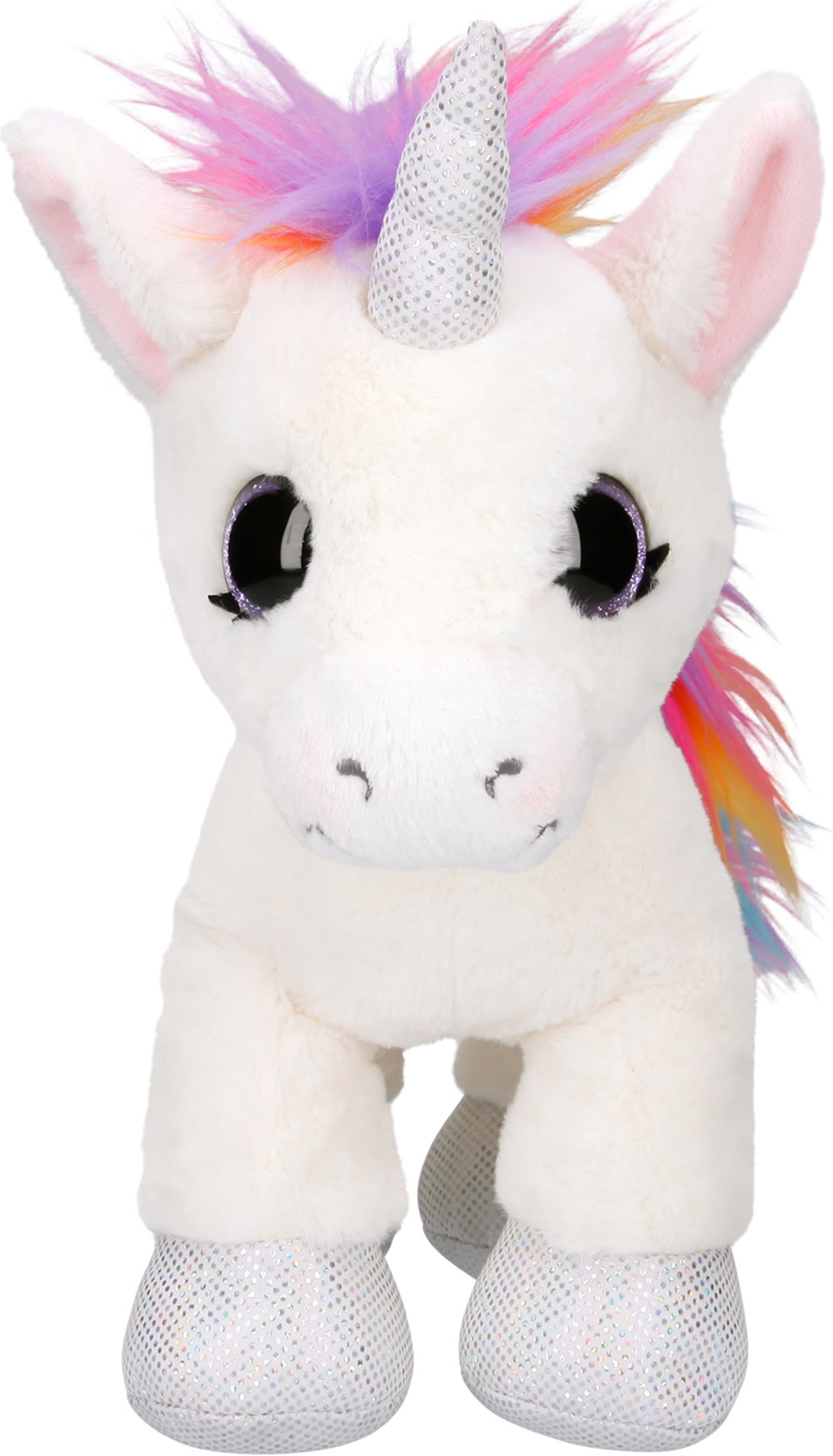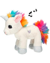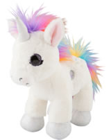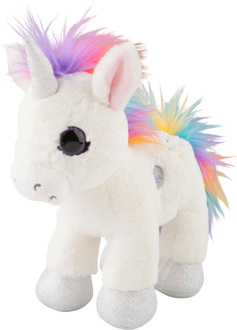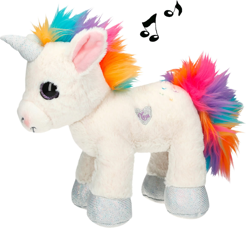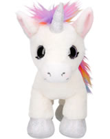 Weiches, weißes Plüscheinhorn Naya mit Regenbogen Mähne und Schweif, Glitzerhorn und -hufe, bunt gestickte Sterne und gesticktes Herz am Bauch. Durch Drücken des Herzens ertönt eine magische Melodie.