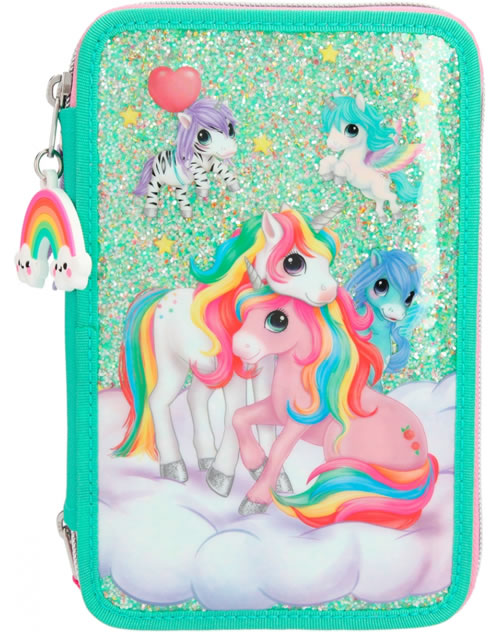 Auf der Vorderseite der Federtasche spielen die Regenbogen-Einhörner vor einem glitzernden Hintergrund.