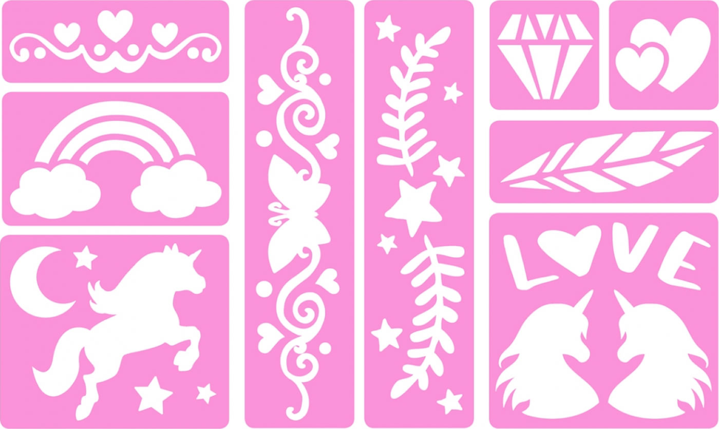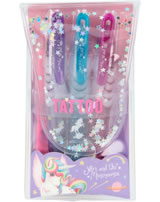 Ein bunt-schillernder Tattoo-Spaß: Mit den 3 Tattoo-Glitzerstiften (Lila, Blau, Pink) und 9 verschiedenen Schablonen lassen sich ganz leicht kleine Kunstwerke auf die Haut zaubern. Auch zum Malen auf Papier geeignet.