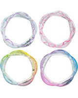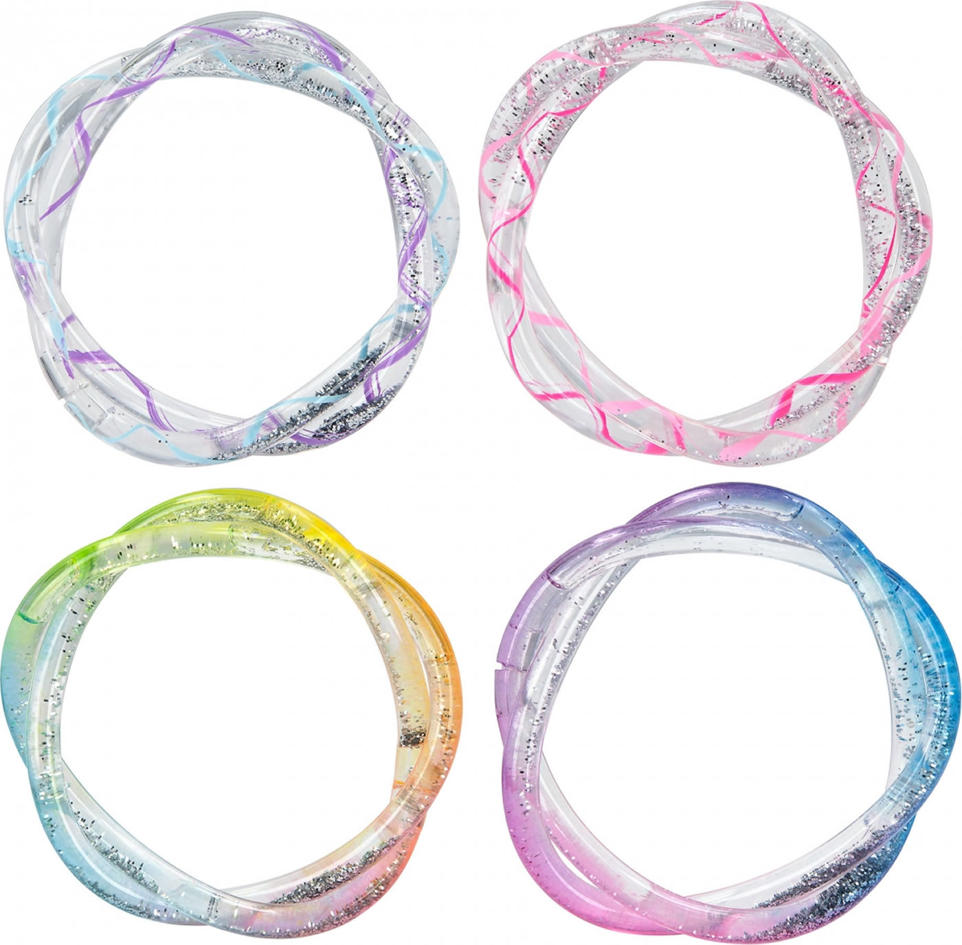 In den transparenten, ineinander gedrehten Armbändern bewegt sich die glitzernde Flüssigkeit hin und her.