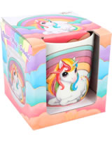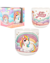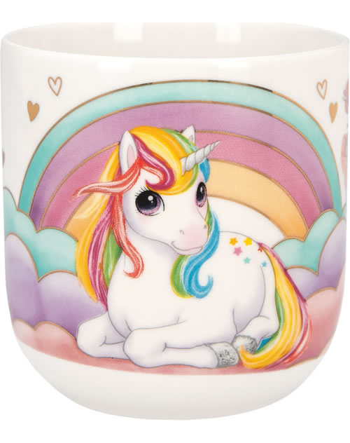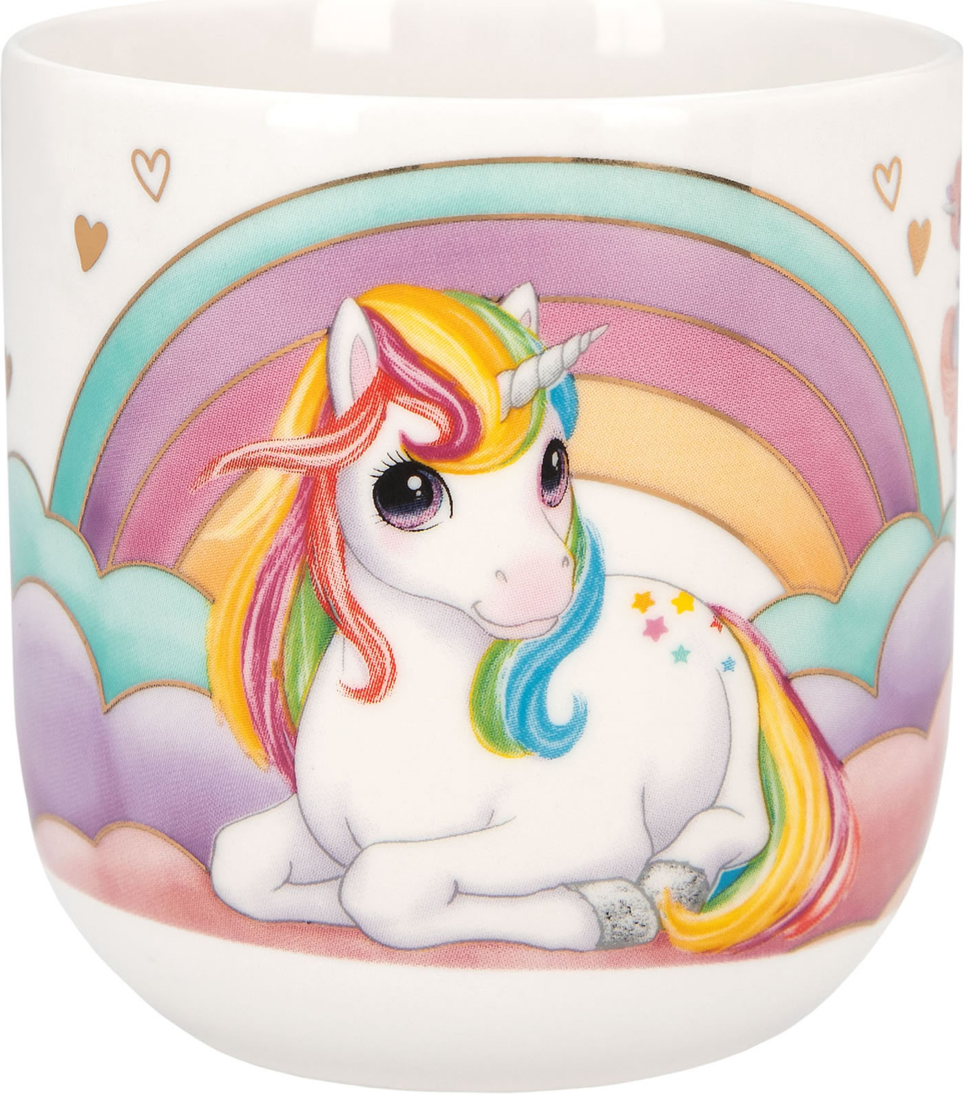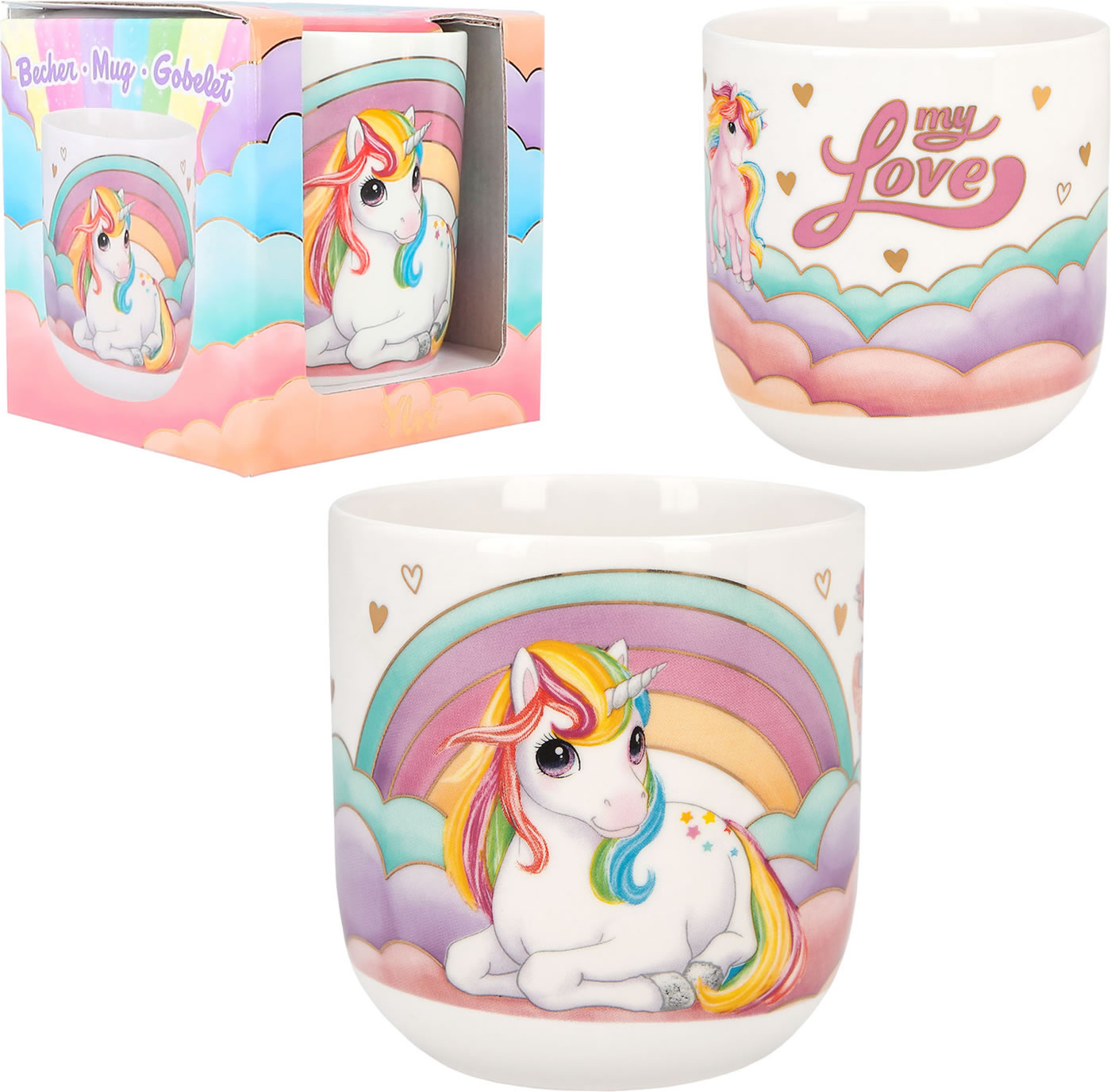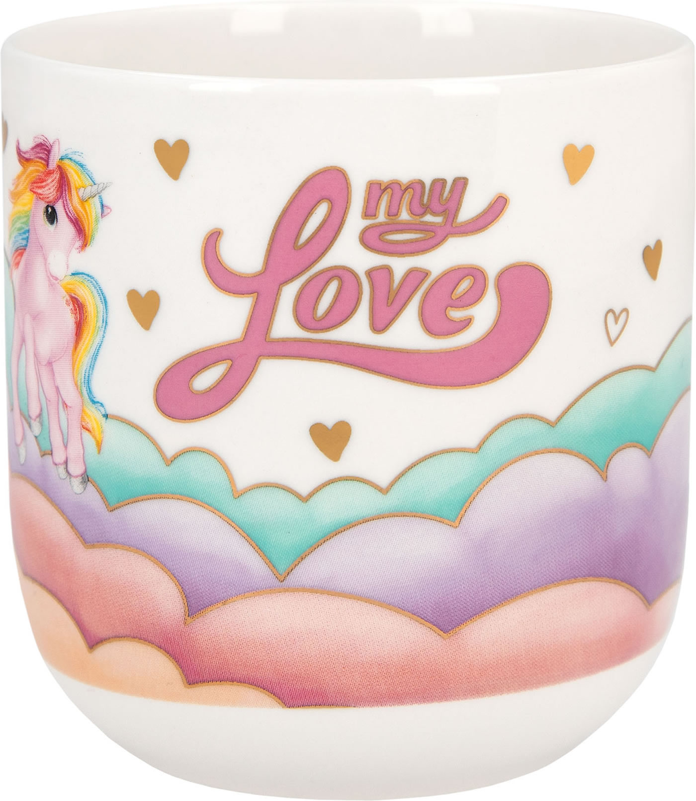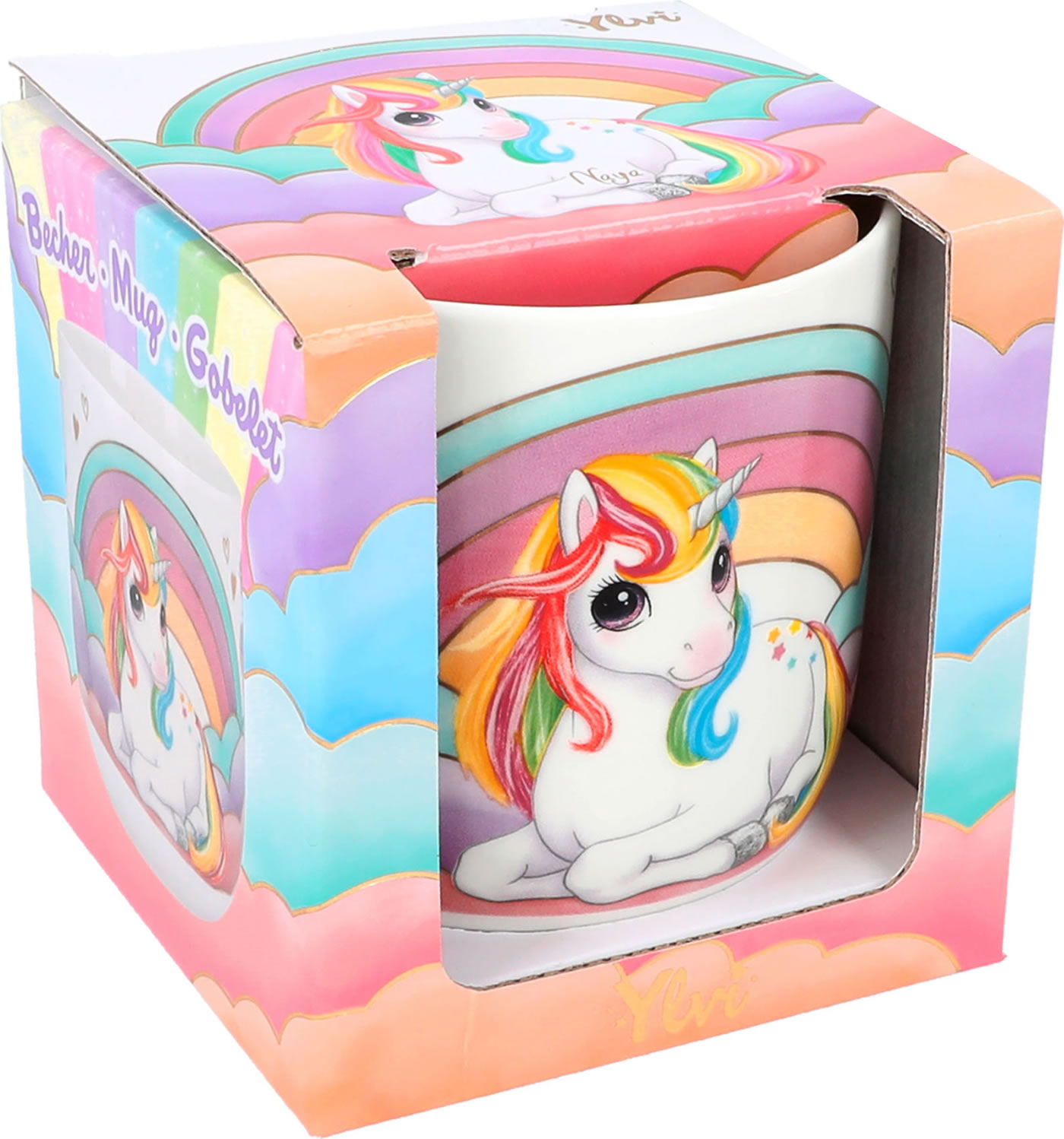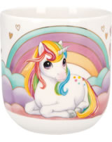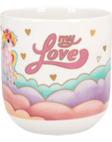 Ob als Lieblingstasse oder Stifteköcher: Der Porzellan-Becher von Ylvi ohne Henkel hat einen aufwendigen, farbenfrohen Aufdruck mit Einhorn Naya, einem bunten Regenbogen, watteweichen Wolken und einem Love-Statement. Aufgrund des edlen (Gold-)Aufdrucks ist der Becher nicht für die Mikrowelle geeignet und sollte nicht in der Spülmaschine gereinigt werden.