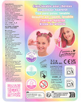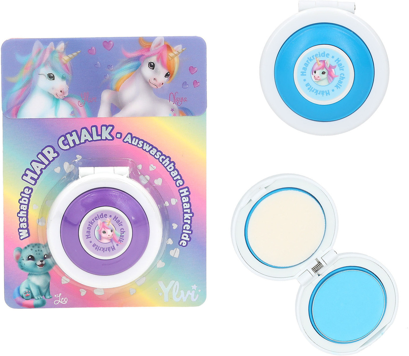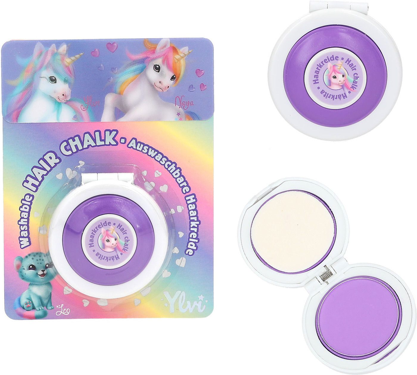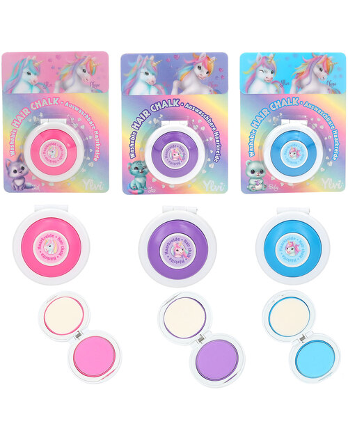 Zauberhaft bunte Haarsträhnen mit der Haarkreide von Ylvi! Das Auftragen funktioniert dank des in der runden Dose integrierten Schwamms ganz einfach.