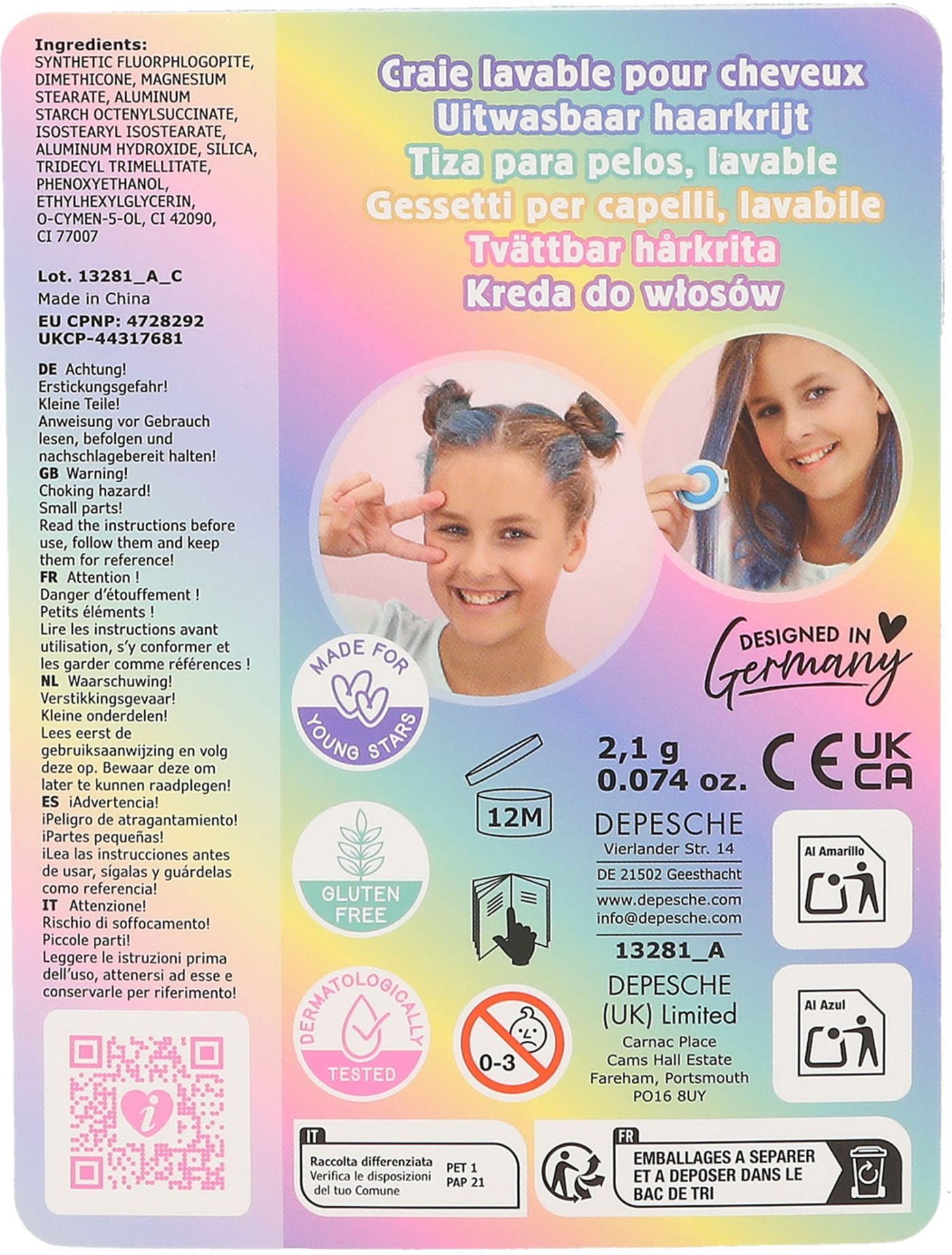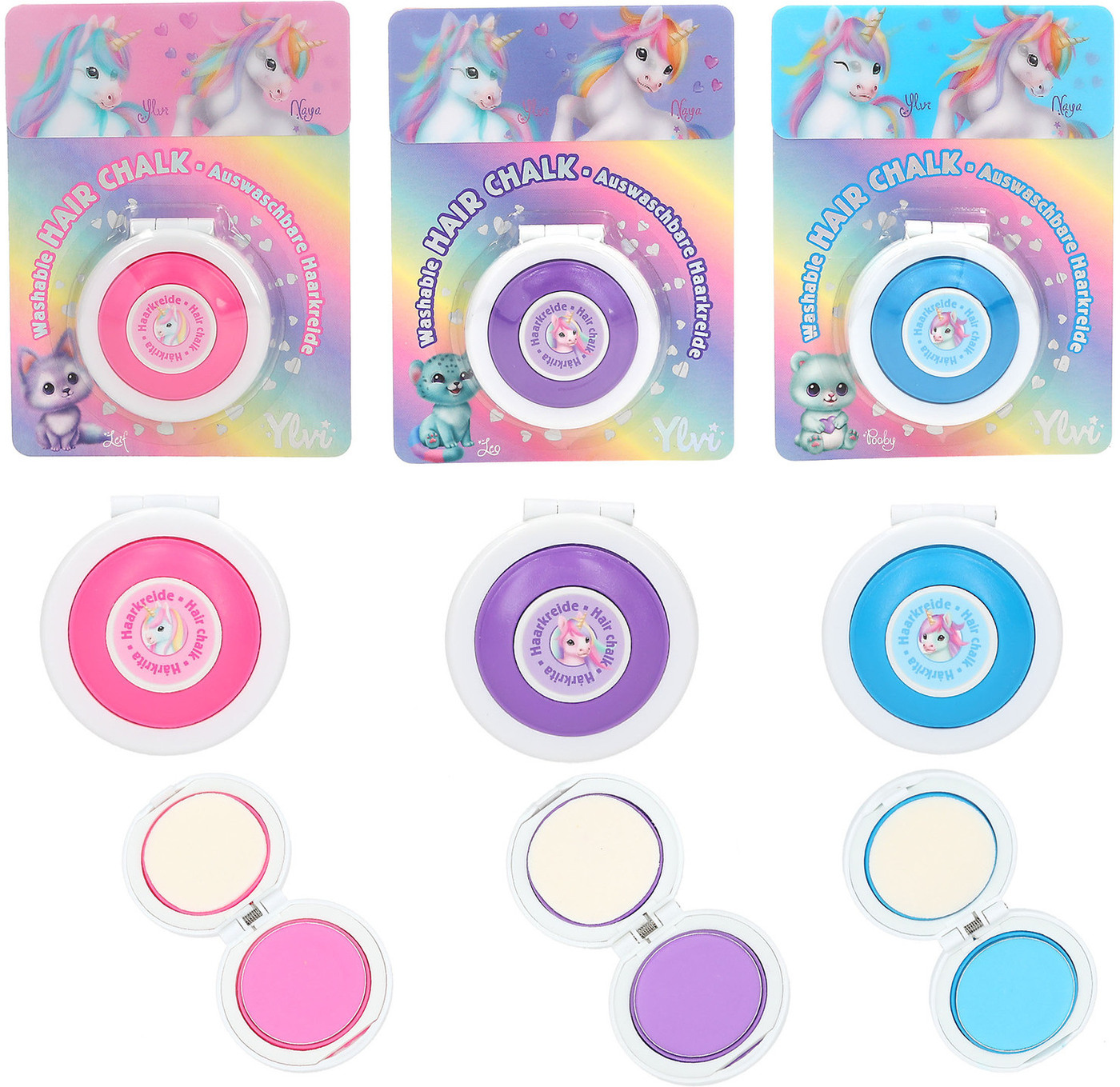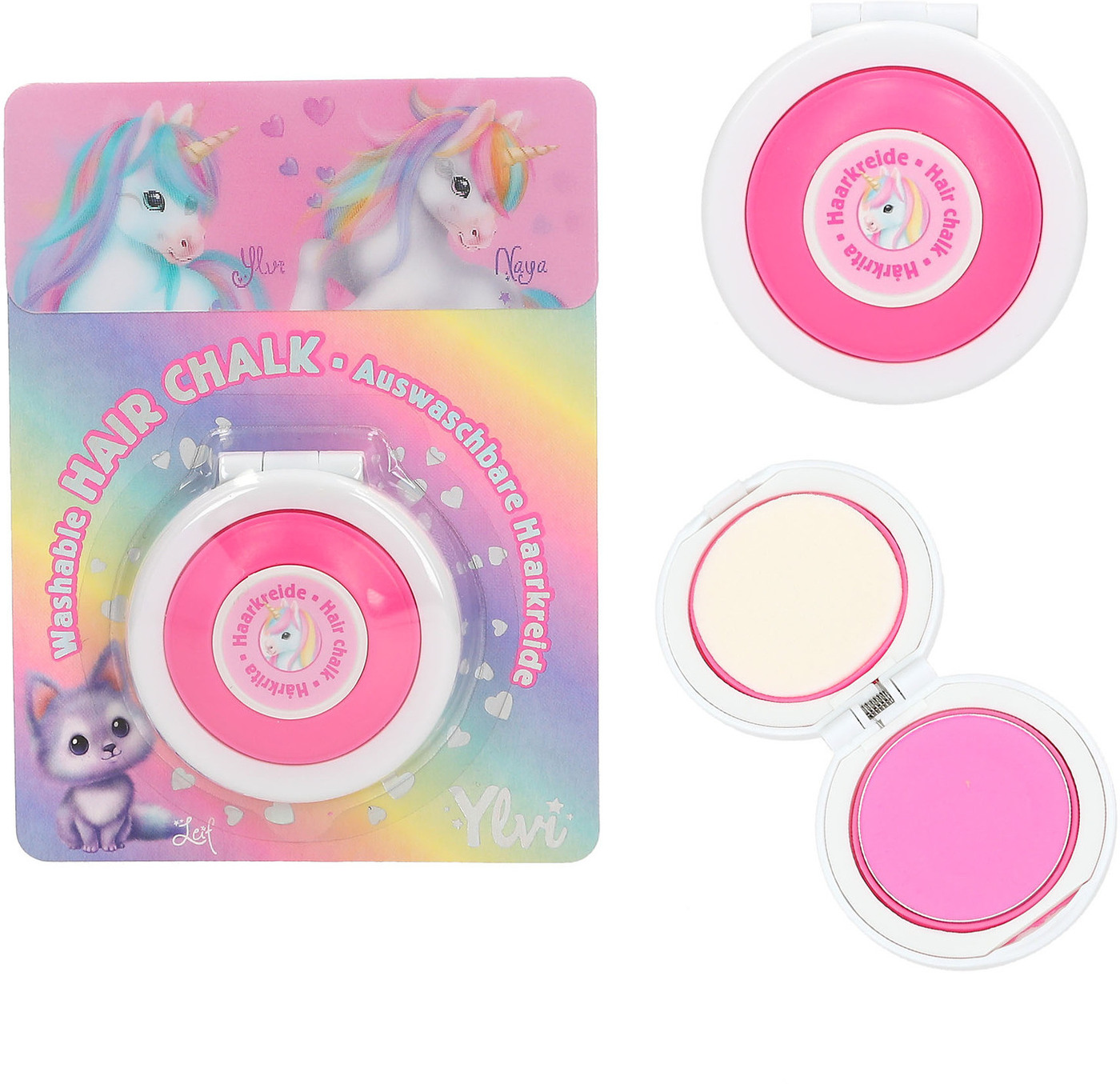 Zauberhaft bunte Haarsträhnen mit der Haarkreide von Ylvi! Das Auftragen funktioniert dank des in der runden Dose integrierten Schwamms ganz einfach.
