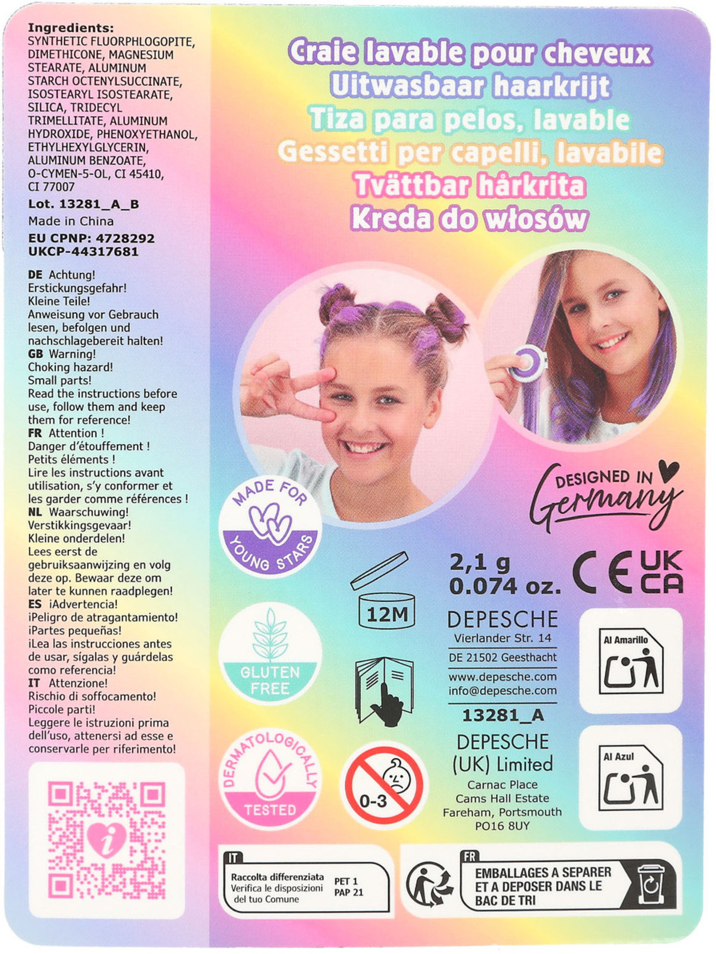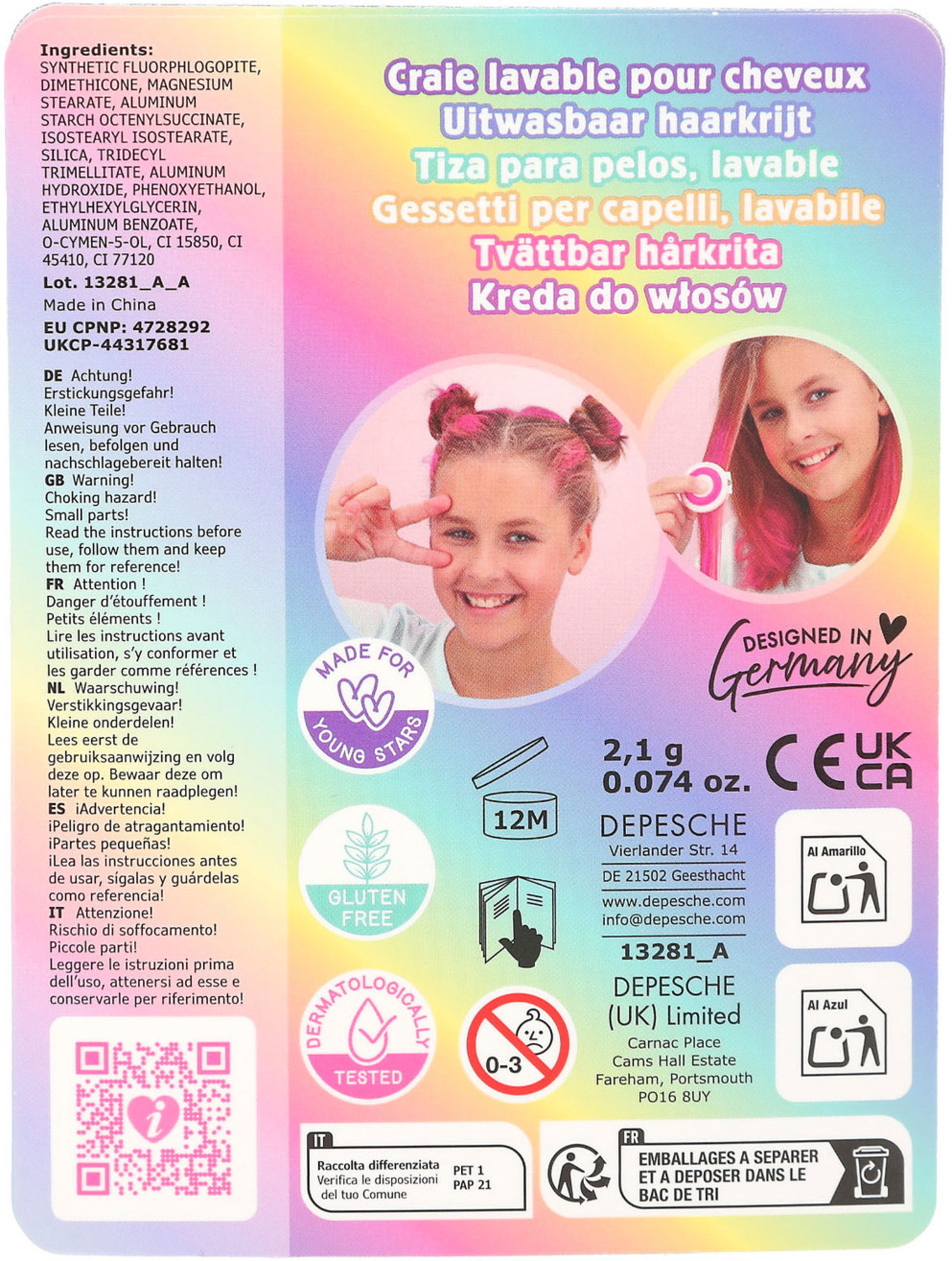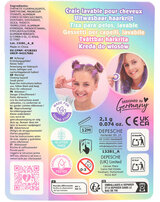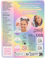 In drei Farben erhältlich: Pink, Lila, Blau. Mit niedlichem Wackelbild auf der Verpackung. Die Farbe ist leicht auswaschbar. 2,1 g Inhalt pro Dose.