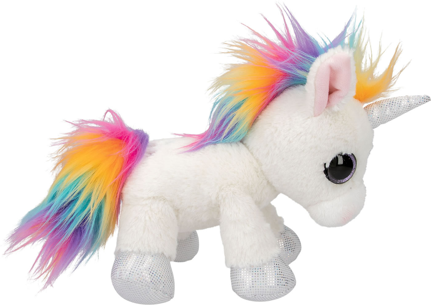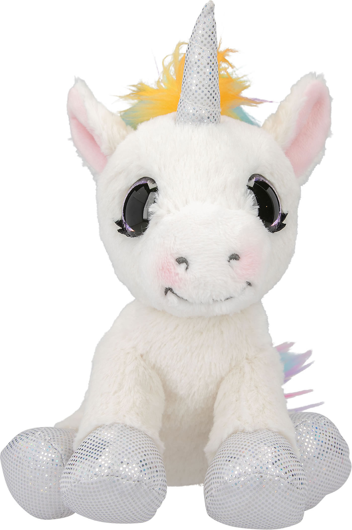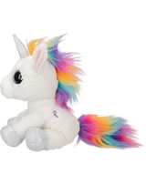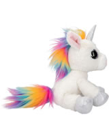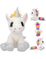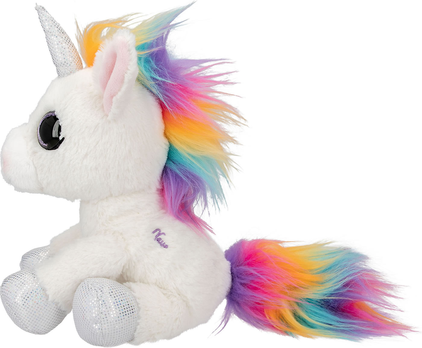 Märchenhaft kuschelig: Das weiße Plüsch-Einhorn Naya hat eine bunte Regenbogenmähne, lila Glitzeraugen und Glitzer-Hufe und -Horn in Silber.