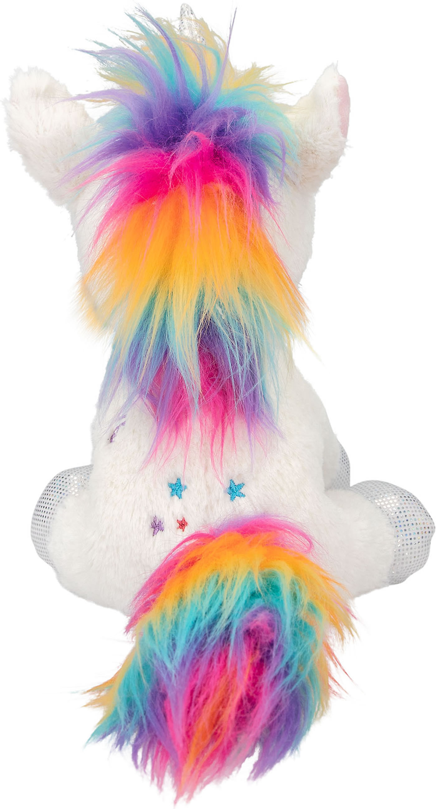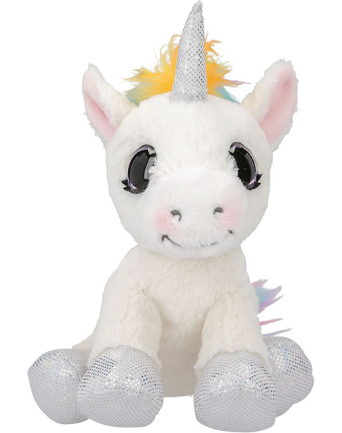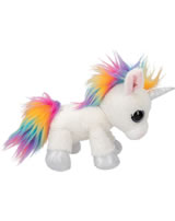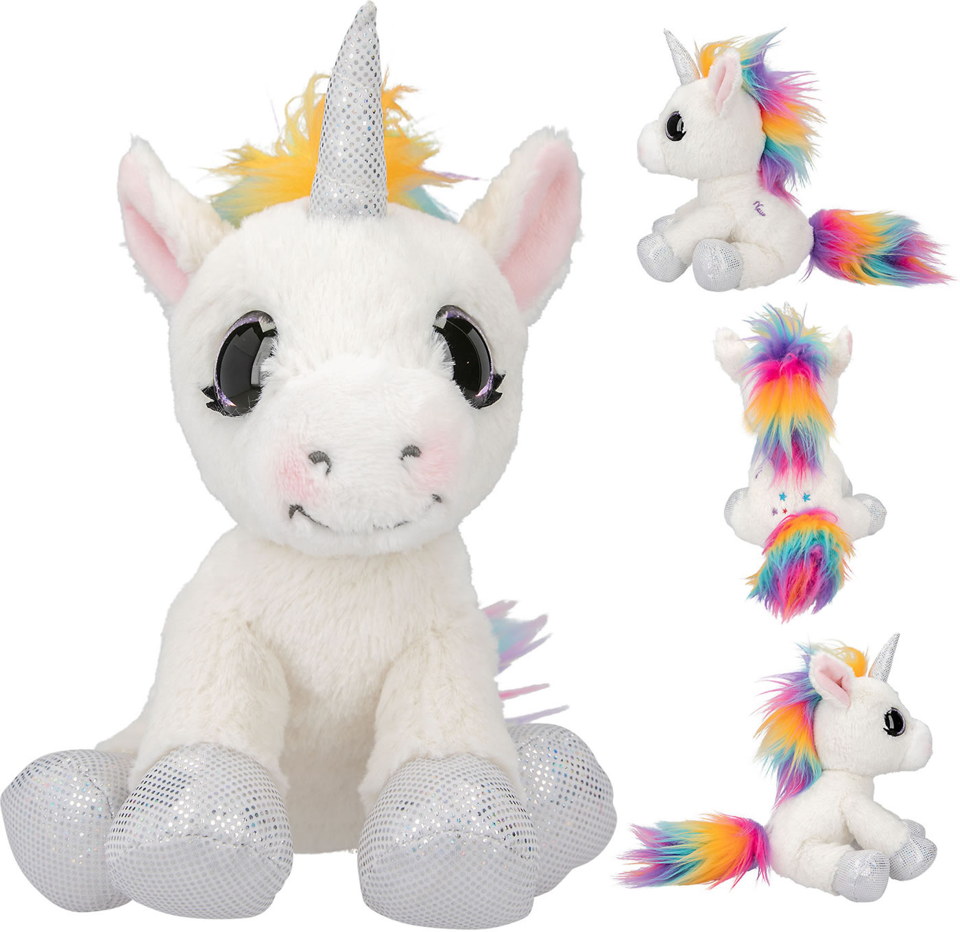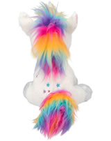 Märchenhaft kuschelig: Das weiße Plüsch-Einhorn Naya hat eine bunte Regenbogenmähne, lila Glitzeraugen und Glitzer-Hufe und -Horn in Silber.